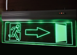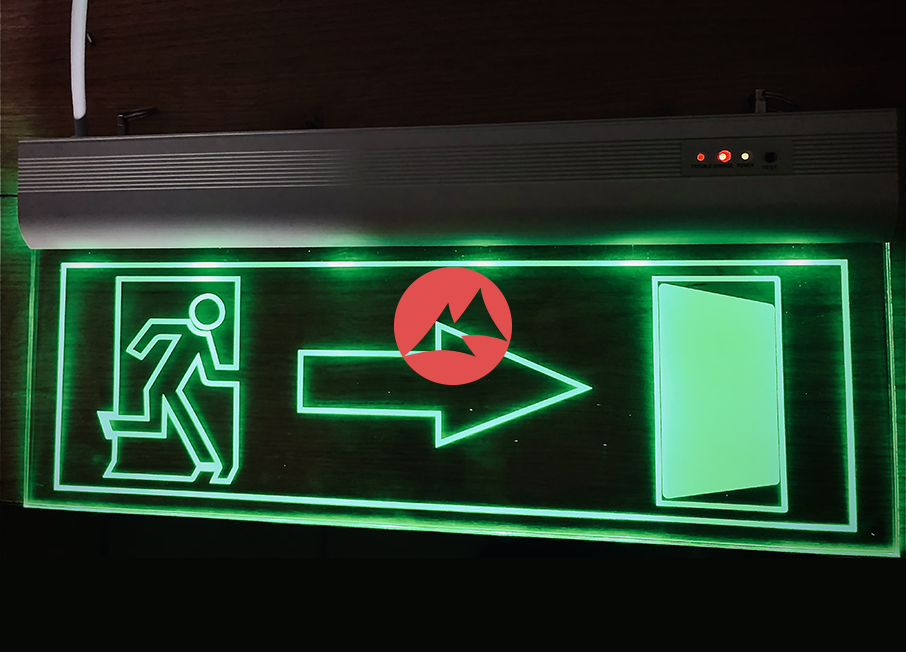 Табличка пожарной безопасности в тонком профиле с аварийным блоком питания.
