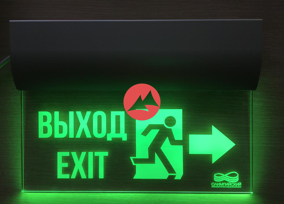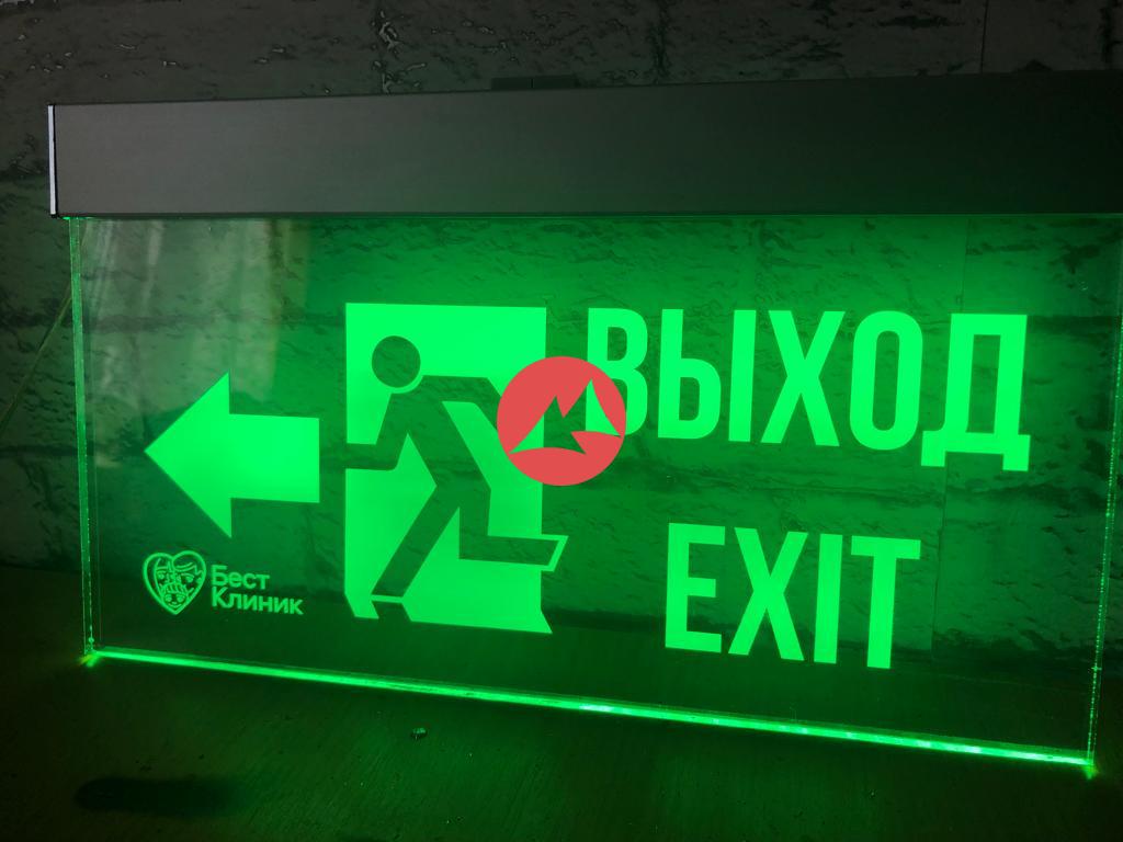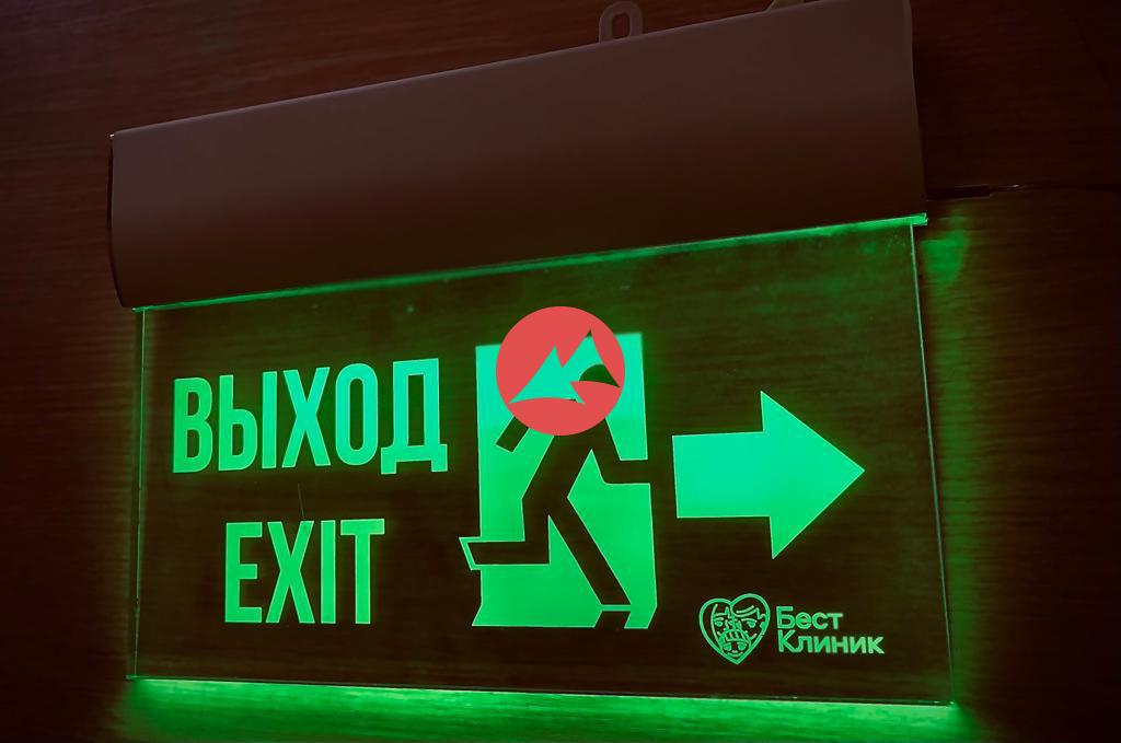 Аварийный указатель выход с надписью ВЫХОД EXIT c логотипом компании.