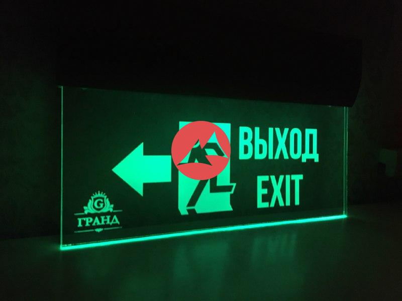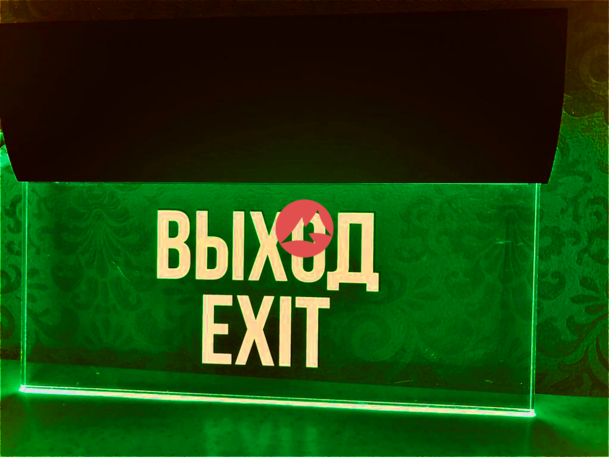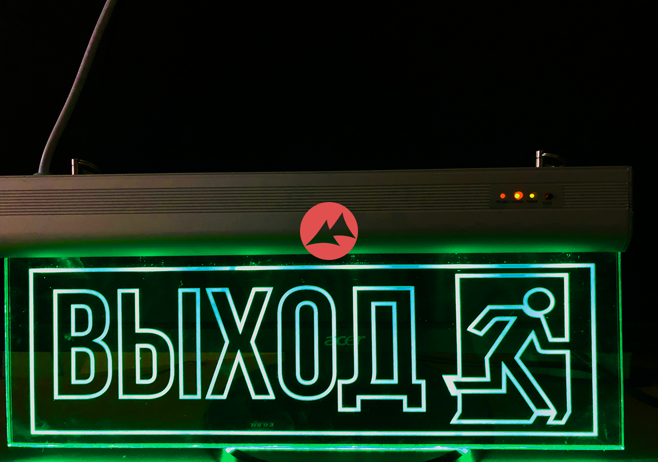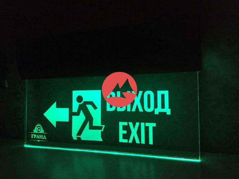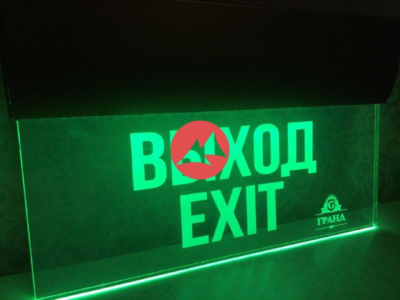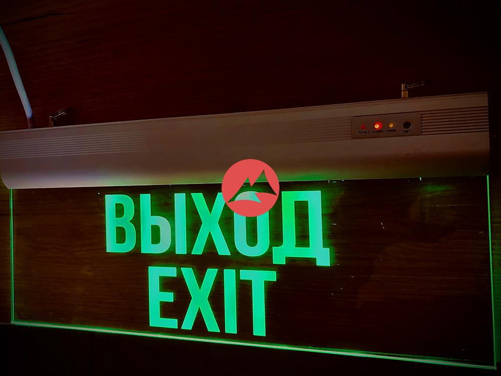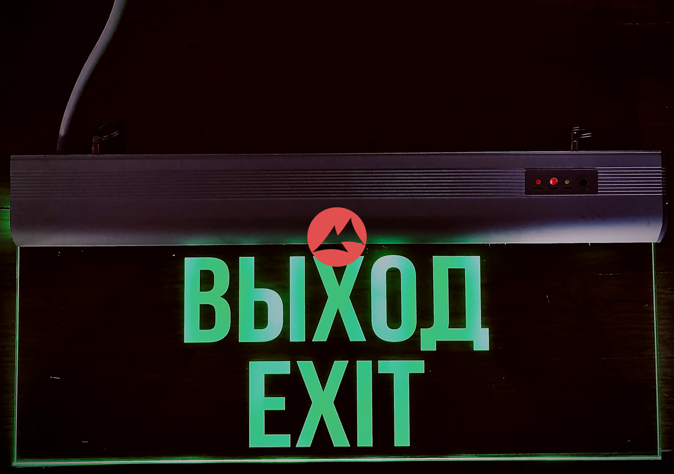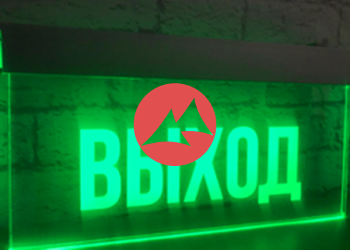 Аварийный указатель выход с надписью ВЫХОД EXIT c логотипом компании.