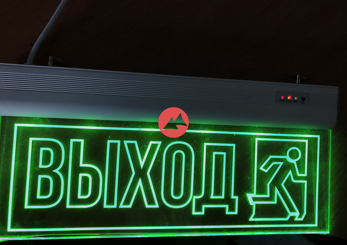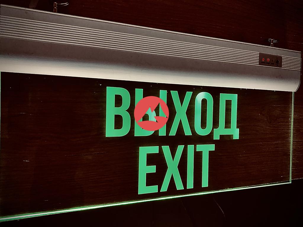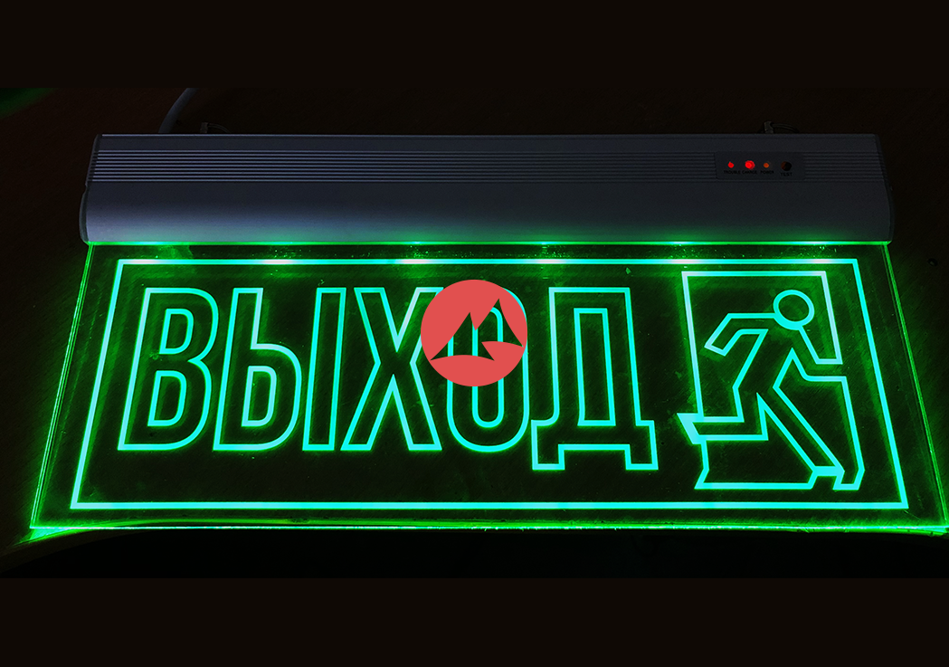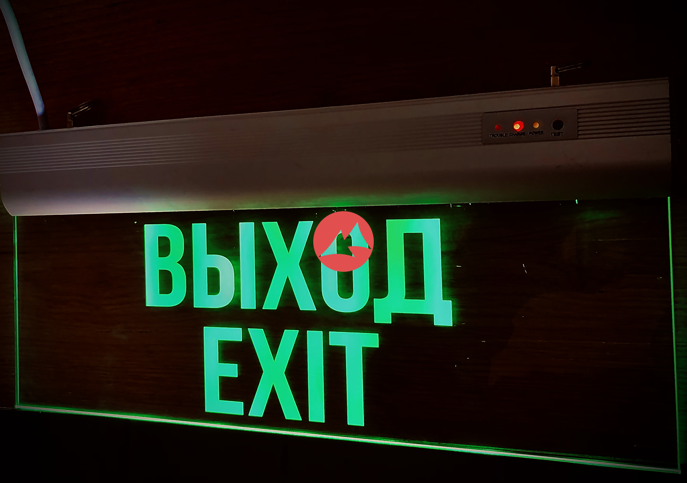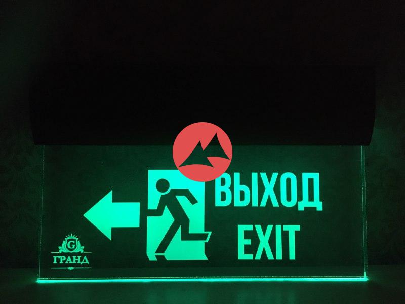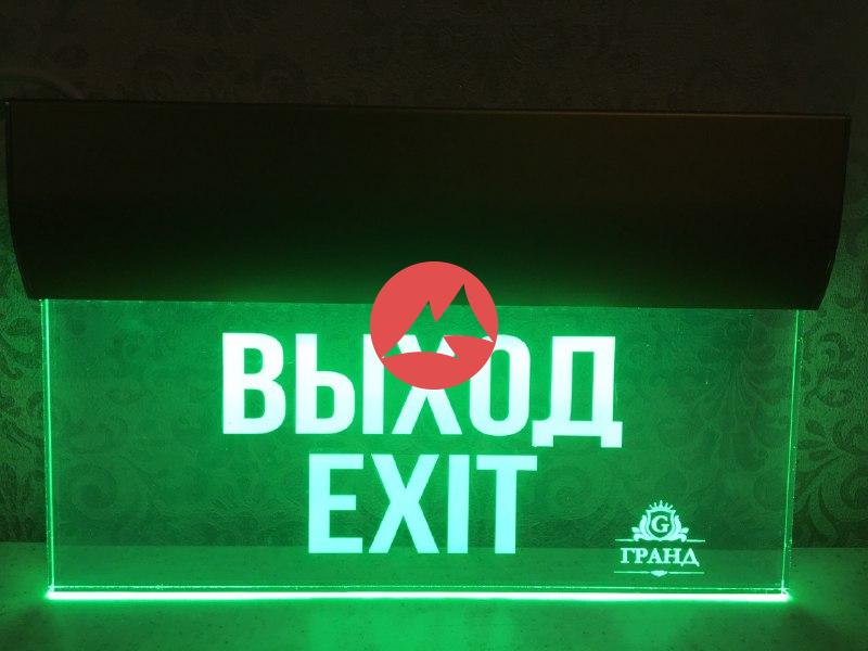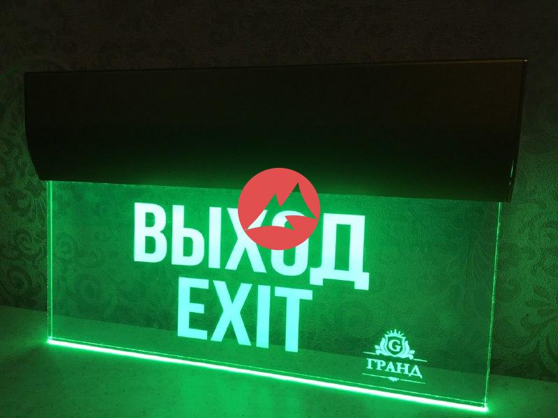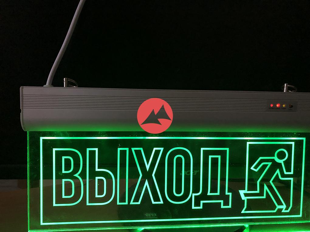 Аварийный указатель выход с надписью ВЫХОД EXIT c логотипом компании.