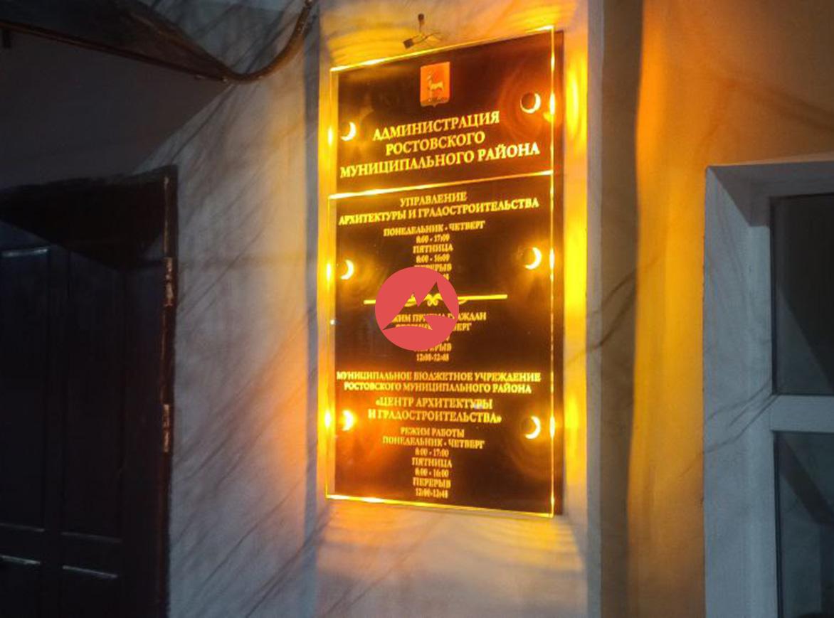 Размер световой вывески 40х60 см. Крепление к стене осуществляется на четырех анкерах в стену. Держатели изготовлены из нержавеющей стали снабжены силиконовыми уплотнительными кольцами для защиты от воды. Крепления снабжены антивандальными болтами. Подводка электроэнергии скрыта, создавая впечатление автономная табличка.