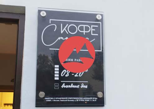 Табличка на вход в помещение кафе изготовлена из Optiwhite 10 мм с пескоструйной гравировкой и нанесение УФ печать для хорошей видимости днем на солнечной стороне. Размер 700 х 500, на 4-х уличных, антивандальных дистанционных держателях из нержавеющей стали со светодиодной матрицей 35 мм. Подложка из ПВХ 5 мм пленка Oracal 641 №01. Крепление на стену на 4 анкерах 8 мм. Питание 12В, 2А.