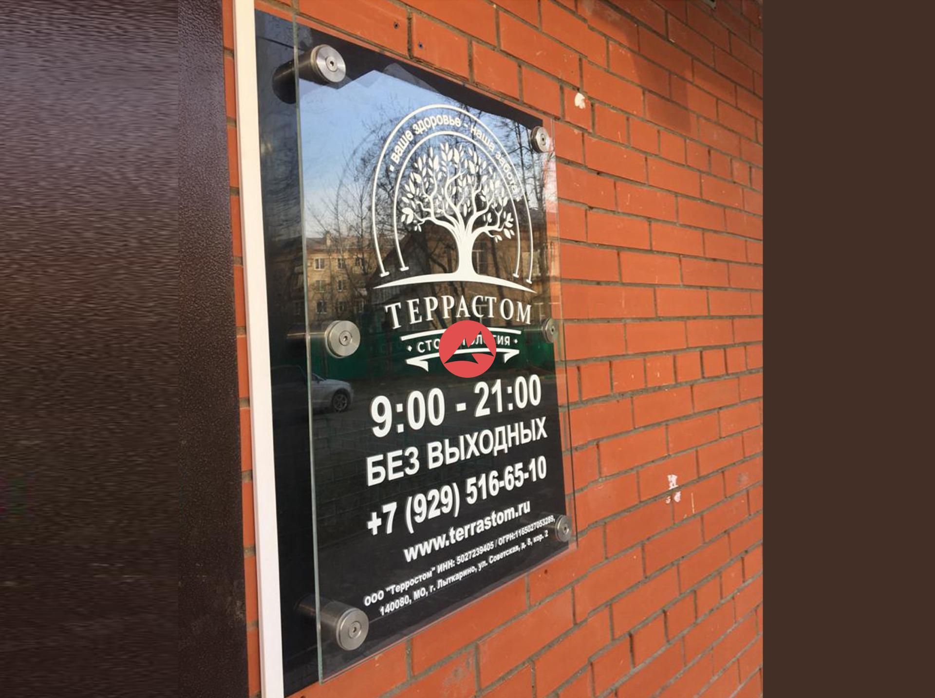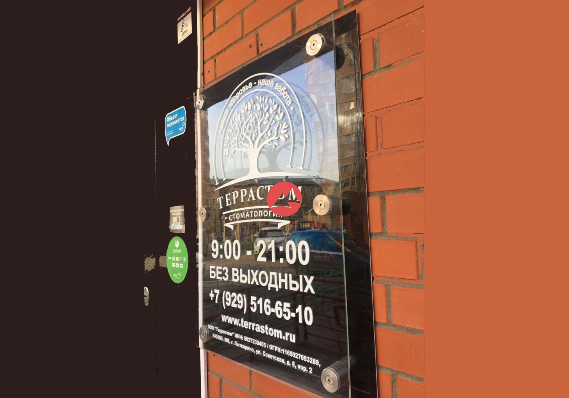 Табличка на вход из закаленного стекла Optiwhite 8 мм с пескоструйной гравировкой размер 70х50 см, на 6-х уличных, антивандальных дистанционных держателях из нержавеющей стали со светодиодной матрицей 35 мм. Подложка из ПВХ 5 мм пленка Oracal. Крепление на стену на 6 анкерах 8 мм. Питание 12В, 2А.