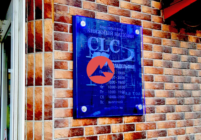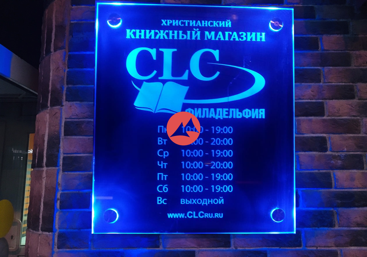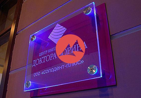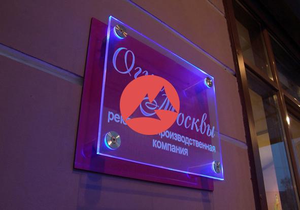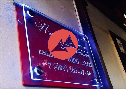 изготовленная из 8 мм закаленного стекла Оптивайт, с гравировкой установленной на светодиодных держателях из нержавеющей стали и подложкой из ПВХ 6 мм оклееной пленкой Oracal под цвет освещения. Размер вывески 60х70 сантиметров.