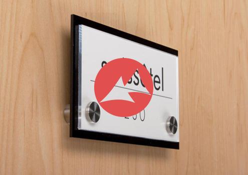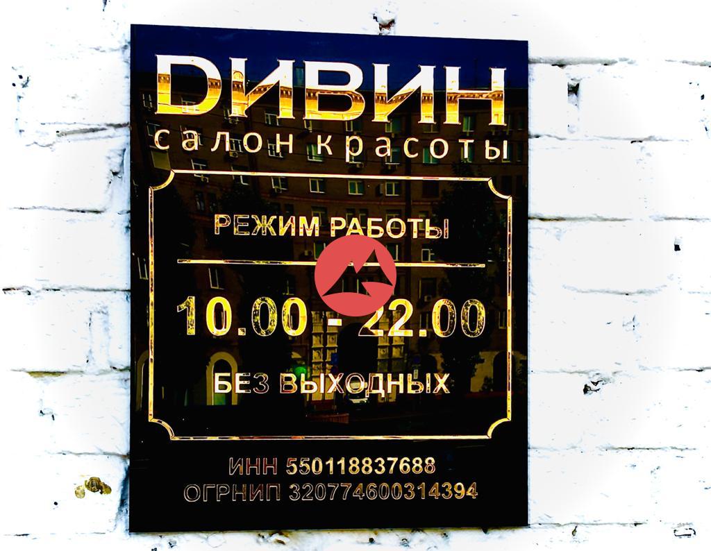 Табличка изготовлена из закаленно, осветленного стекла 6 мм, с элементами зеркального акрила и дистанционными держателями для крепления к стене с отрыворм 25 мм. Изображение нанесено путем УФ печати с зеркальной стороны таблички.