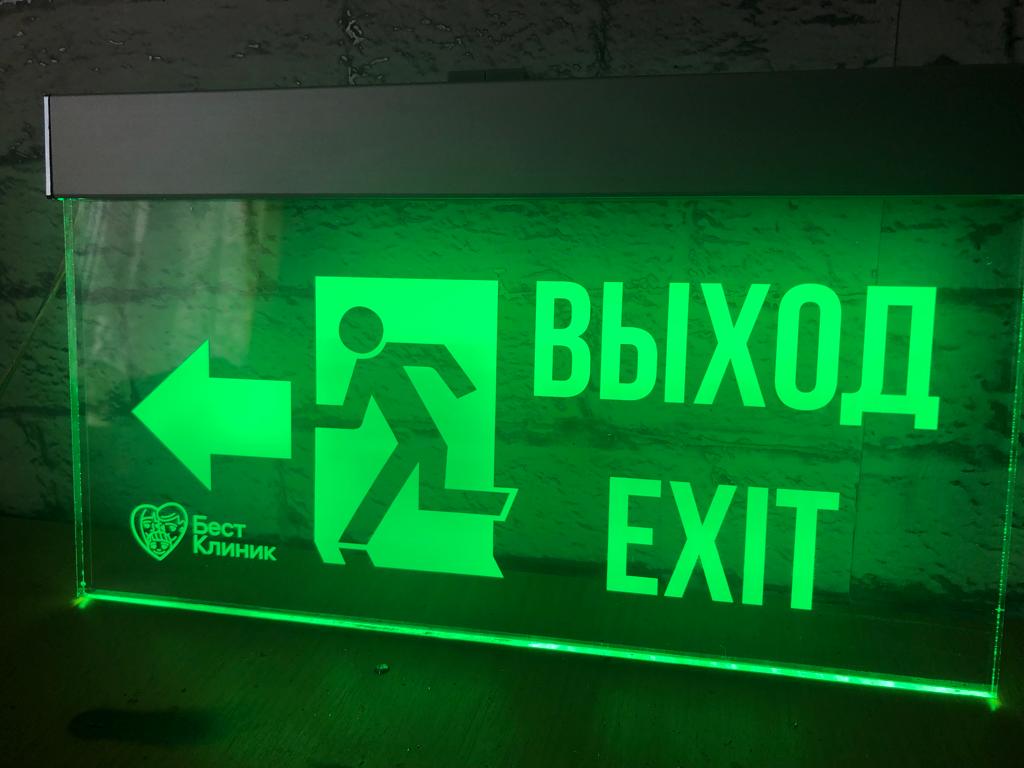 Аварийный указатель выход с надписью ВЫХОД EXIT c логотипом компании.