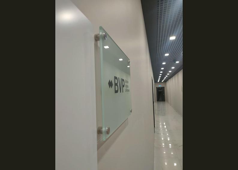 Табличка из матированого стекла без подсветки с использованием качественной УФ печати на дистанционных держателях из нержавеющей стали.